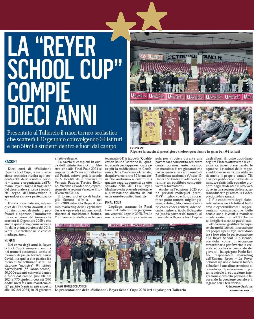 Leggi la presentazione ufficiale della manifestazione sul sito Reyer: https://www.reyer.it/news/giovanile/2024-12-19/volksbank-reyer-school-cup-presentata-la-decima-edizione/